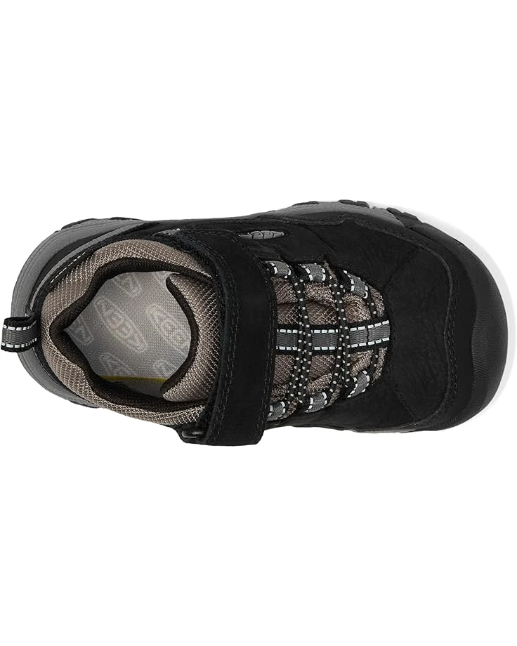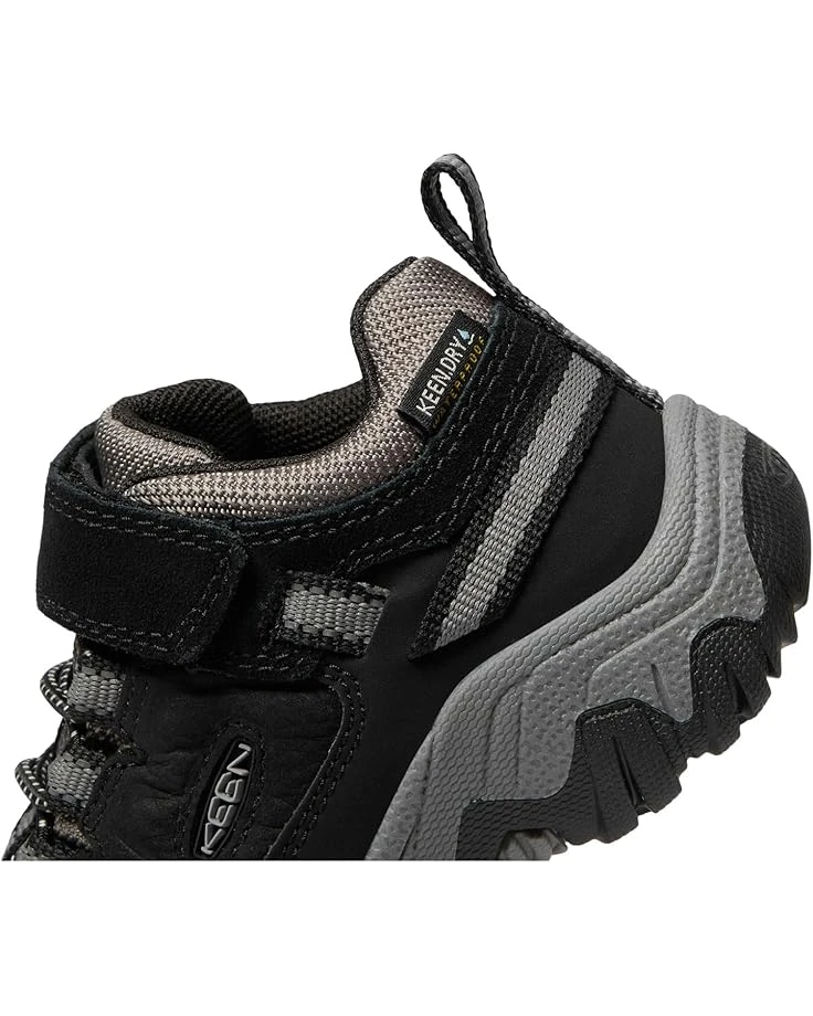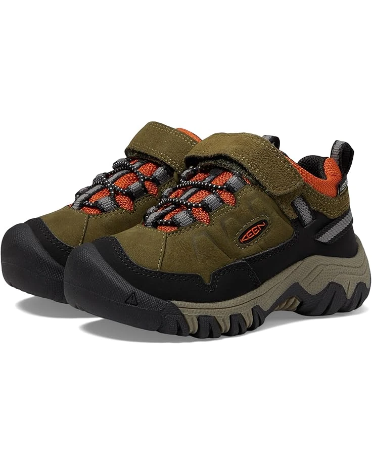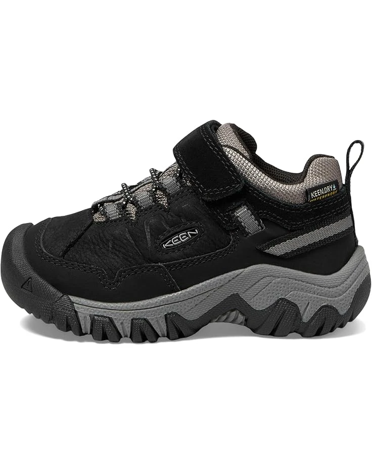 - Comfortable straight out of the box, the KEEN® Kids Targhee 4 Low Height Durable Comfortable Waterproof shoes are made to keep with a fused leather upper and rubber outsole plus super-resilient cushioning. Featuring durable direct-attach construction and all-terrain traction, these hiking shoes are built off KEEN’s traditional wider footwear form. The KEEN.DRY® waterproof breathable membrane keeps your kid’s feet dry and comfortable all day long by allowing vapor out without letting water in. With a hook-and-loop strap for easy on and off, these lace-up shoes will be your kid’s favorite companion for different adventures.